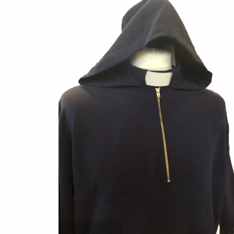 The Marsha Hoodie is a loose fitting sweatshirt in cotton jersey with a warm, fluffy inside. It has a pocket across the front and long sleeves with closer fitting cuffs and band at the hem and a hood. There is a zip at the front neck and it is available in black or navy.