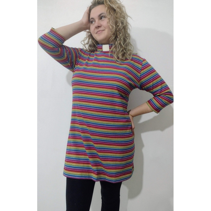 The Maisie rainbow tunic is a fitted tunic in rainbow stripes. Made out of cotton jersey, it has a z..