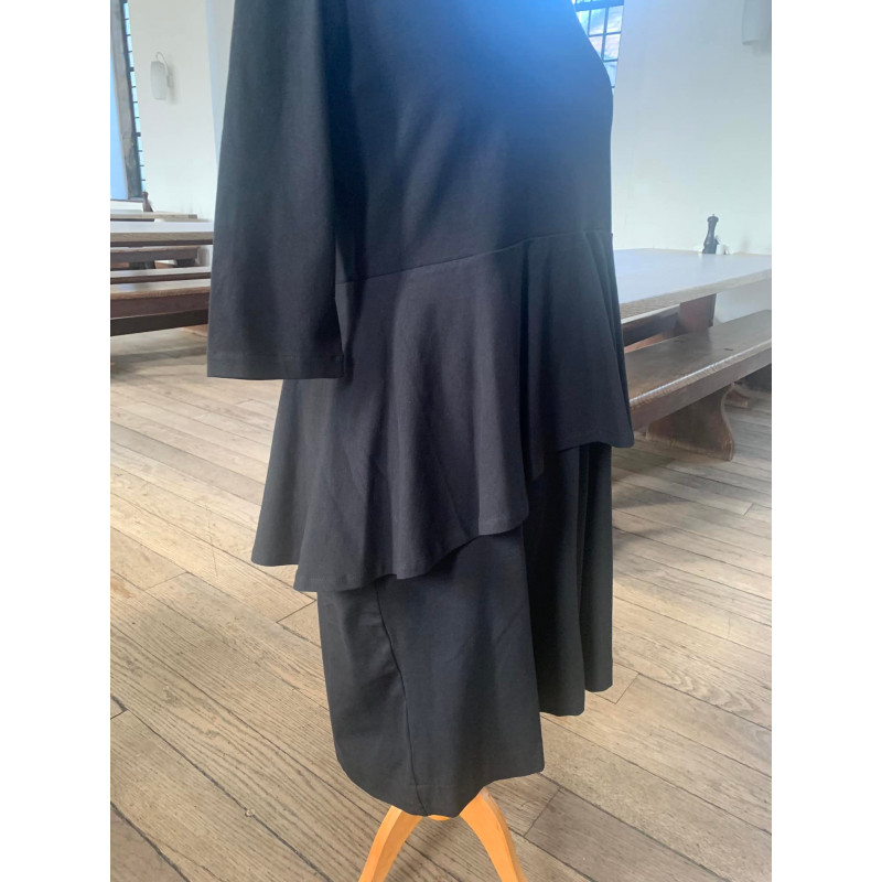 The Mallory tunic is a fitted tunic with a peplum at the waist which is longer at the back. Made out of cotton jersey, it has a zip at the back neck and comes in a wide variety of colours and a choice of sleeve lengths. For a small extra charge pockets can be added. Picture shows the dress version.