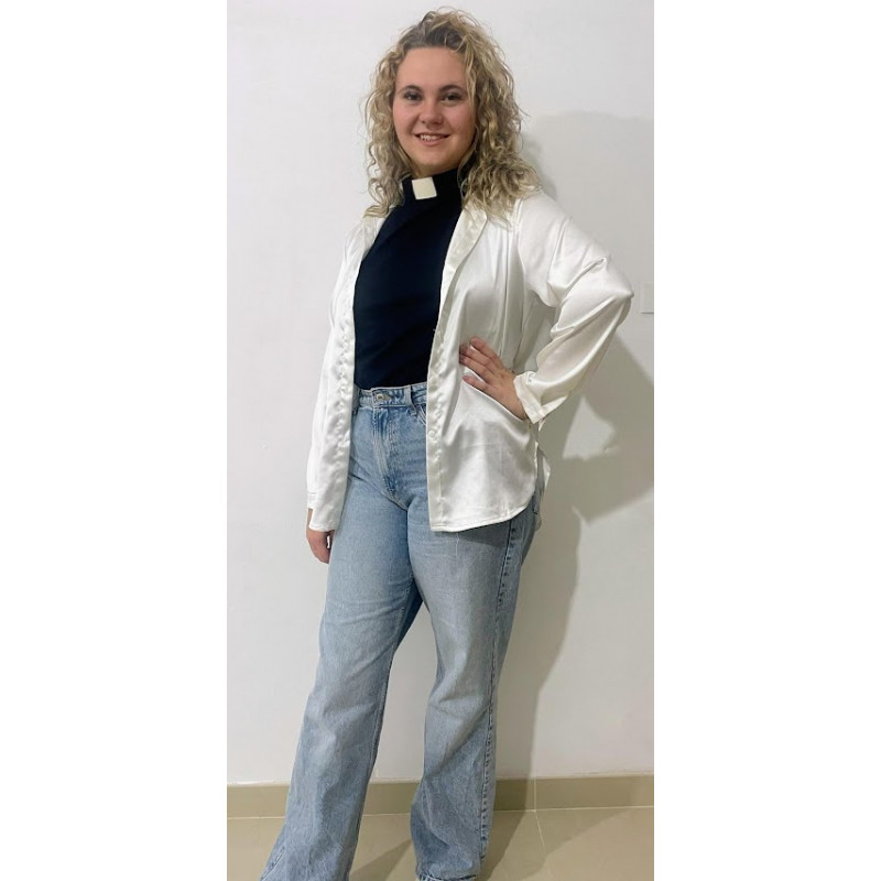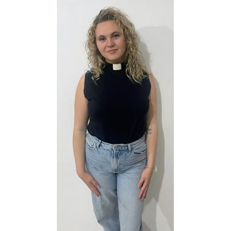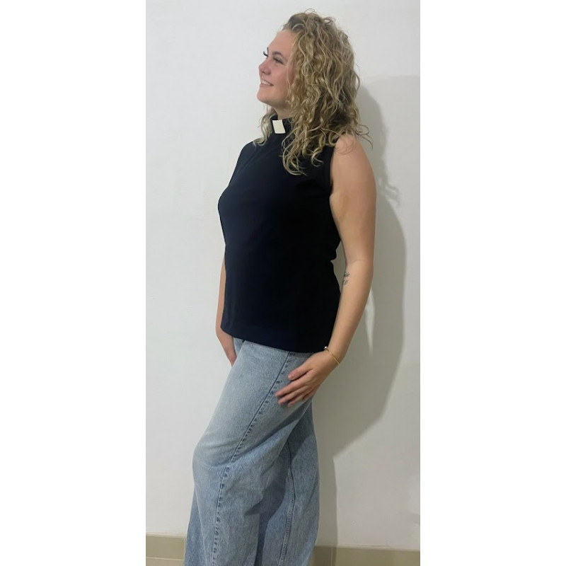 The Margaret sleeveless top is a fitted top made in cotton jersey. Available in a wide range of colours, it has a zip at the back and can be worn on it's own or as a base garment underneath non collared clothes to enable you to wear your collar with any outfit.