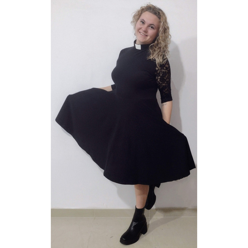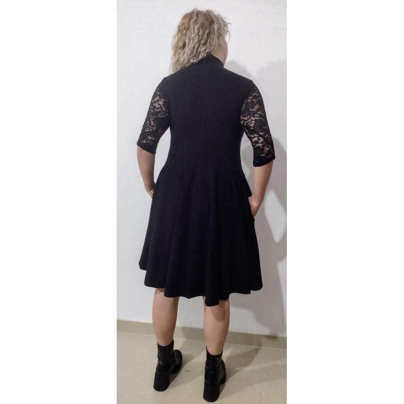 The Marlene dress is a skater dress with matching lace sleeves, fitted at the top with a very flared skirt. Made out of cotton jersey, it has a zip at the back neck and comes in a choice of sleeve lengths. Only available in black at the moment but new colours will be added soon. For a small extra charge pockets can be added.