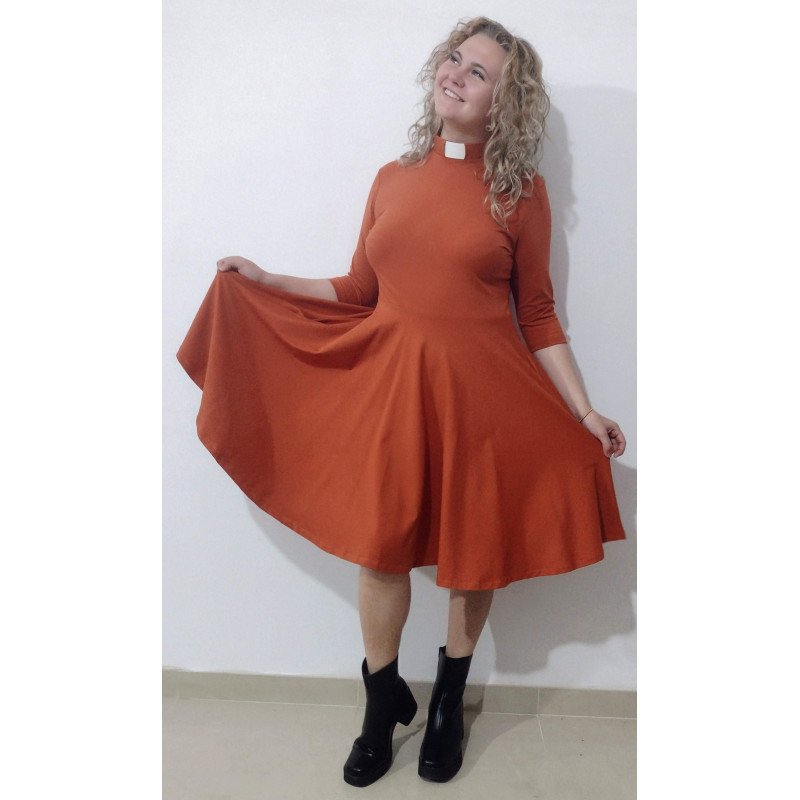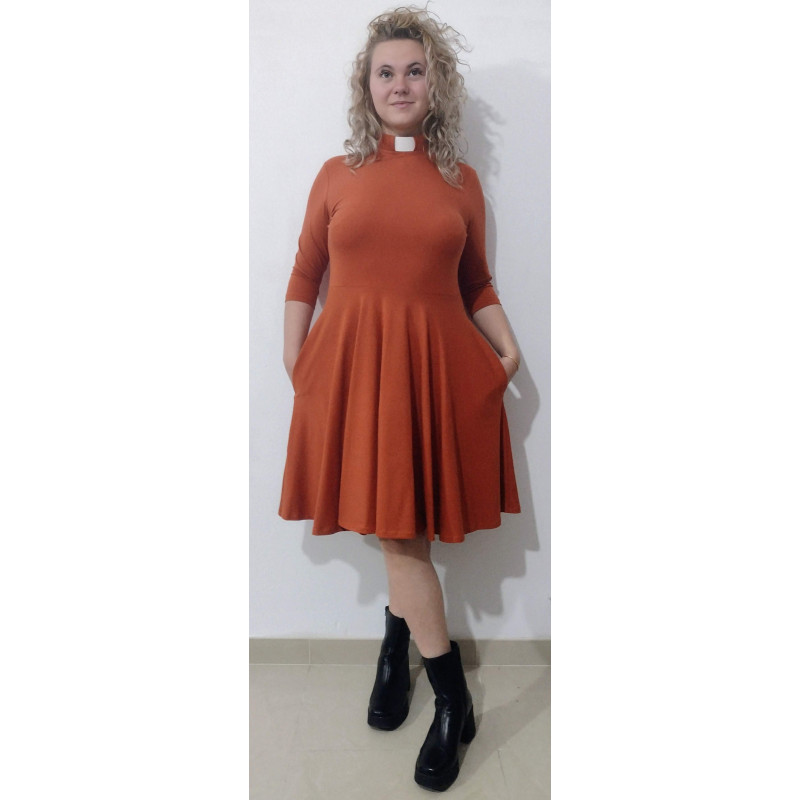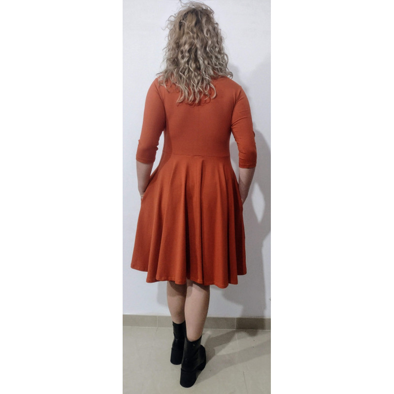 The Marnie skater dress has a fitted top and a very flared skirt.. It has a zip at the back neck and comes in a wide variety of colours and options for sleeve length. For a small extra charge, pockets can be added.