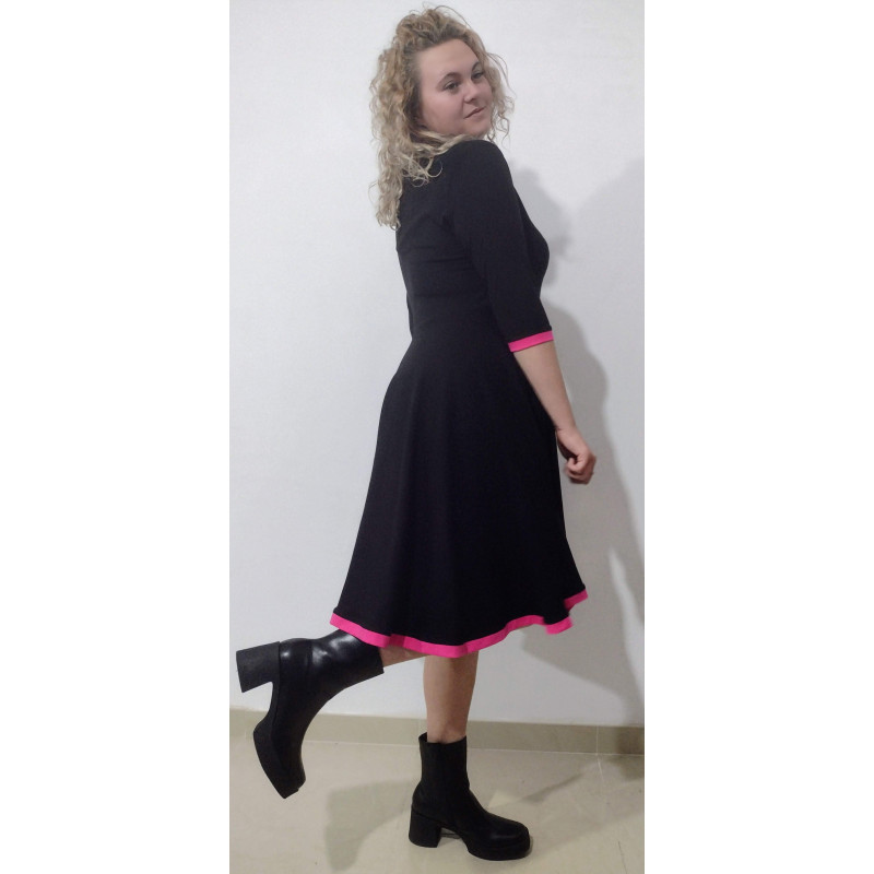 The Maryam dress is fitted at the top with a very flared skirt. It has a contrast trim at the skirt ..
