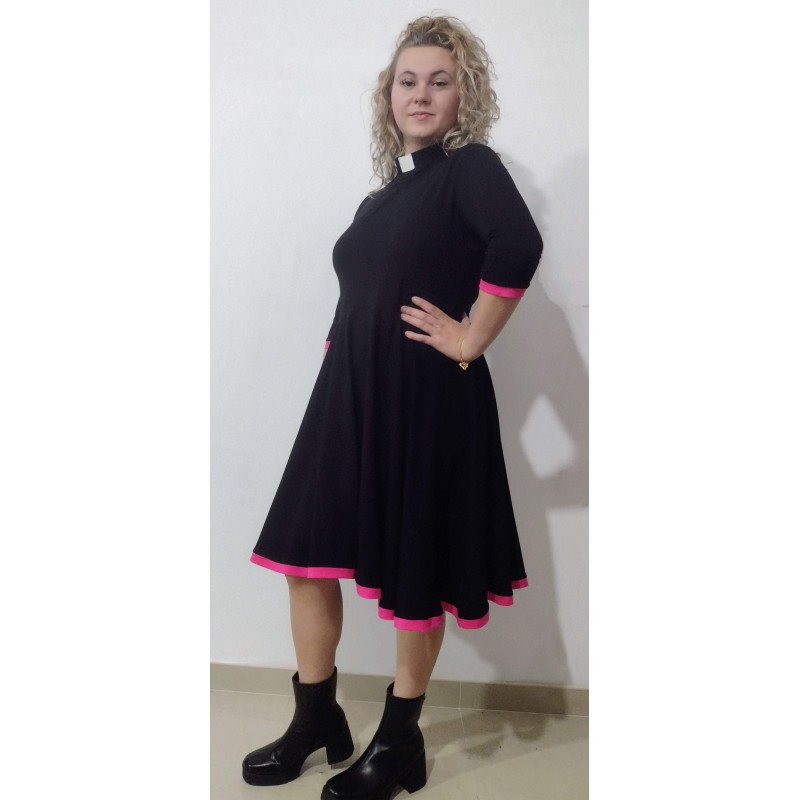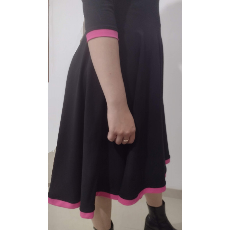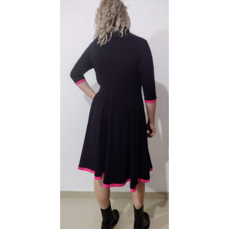 The Maryam dress is fitted at the top with a very flared skirt. It has a contrast trim at the skirt and sleeve hems. Made out of cotton jersey, it has a zip at the back neck and comes in a wide variety of colours and a choice of sleeve lengths. For a small extra charge pockets can be added.