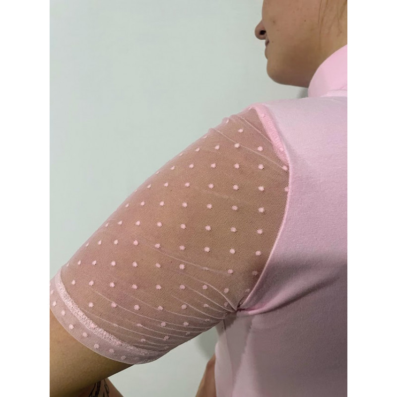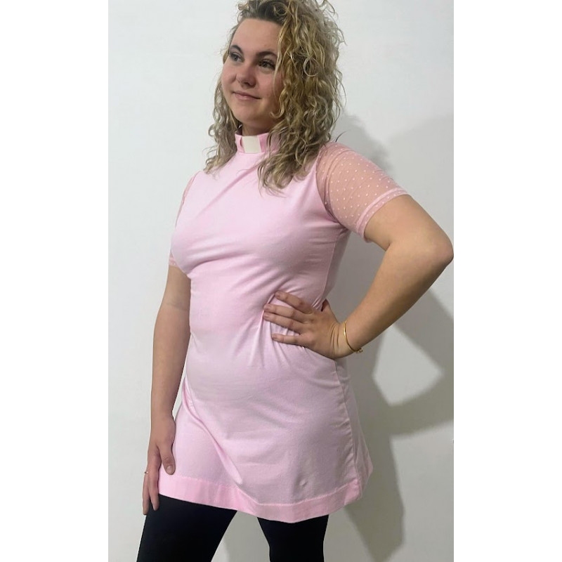 The Matilda tunic is a fitted tunic that has spotted mesh sleeves.  Made out of cotton jersey, it has a zip at the back neck and is available in black and baby pink with a choice of sleeve lengths. Pockets can be added for a small extra cost.